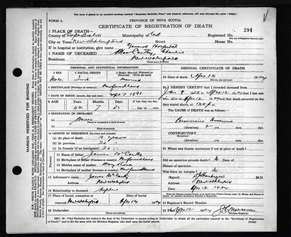 Male Death Registration: Year: 1924 file: 79 number: 294