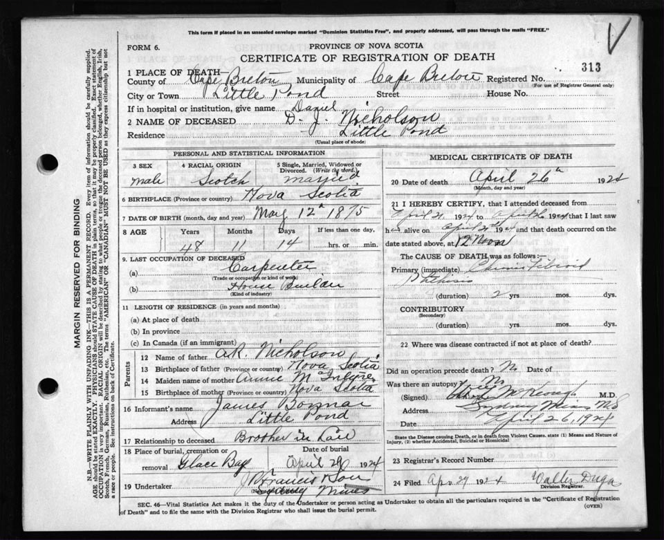 Death Registration: Year: 1924 file: 79 number: 313