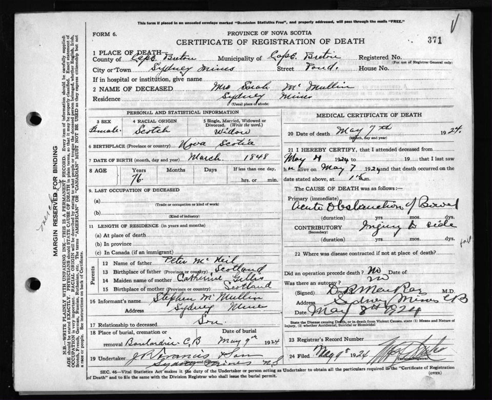 Death Registration: Year: 1924 file: 79 number: 371