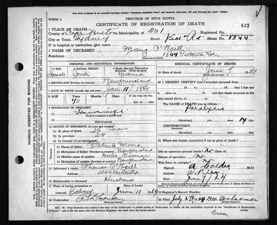 Death Registration: Year: 1924 file: 79 number: 423