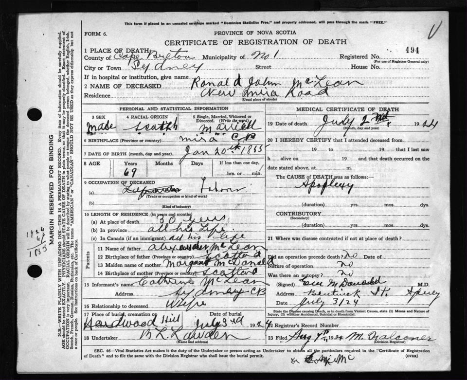 Death Registration: Year: 1924 file: 79 number: 494