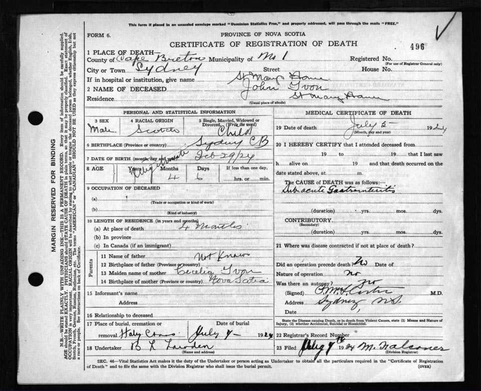 Death Registration: Year: 1924 file: 79 number: 496