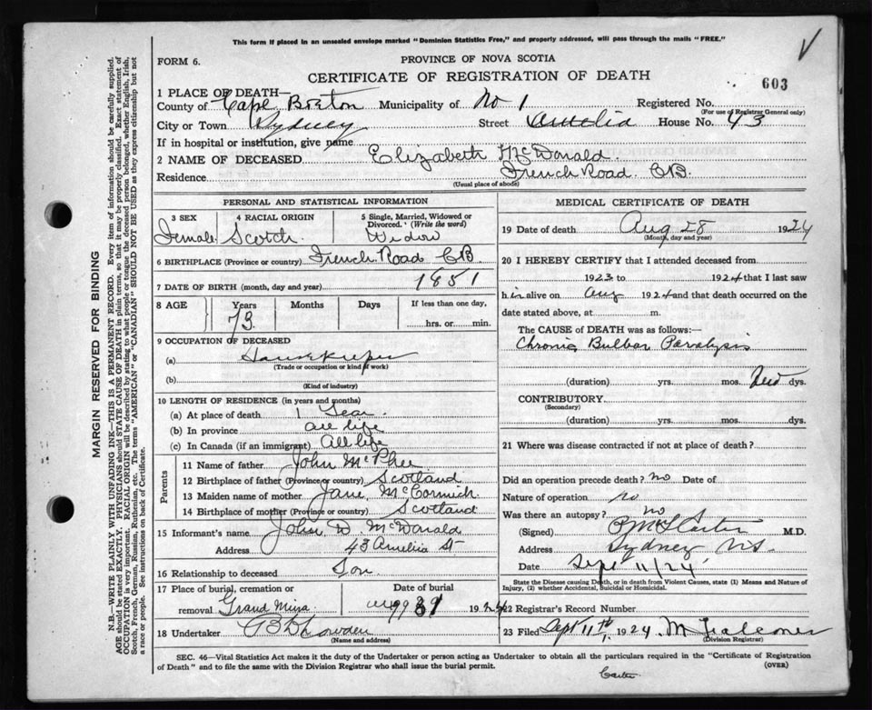 Death Registration: Year: 1924 file: 79 number: 603
