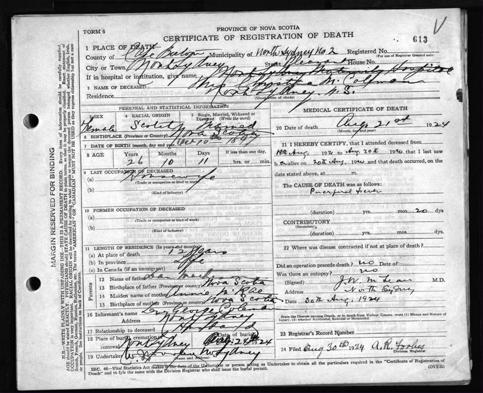 Death Registration: Year: 1924 file: 79 number: 613
