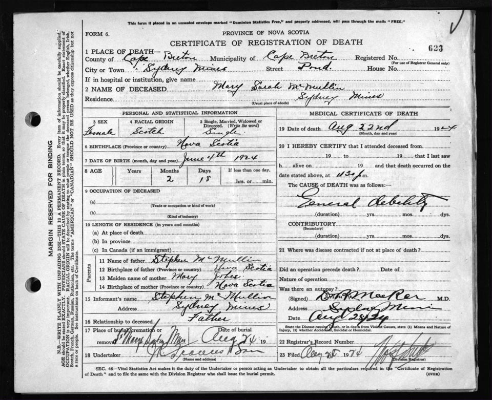 Death Registration: Year: 1924 file: 79 number: 623