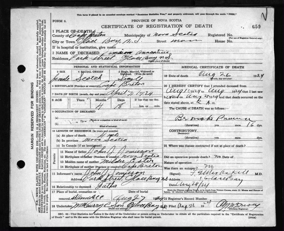 Death Registration: Year: 1924 file: 79 number: 659
