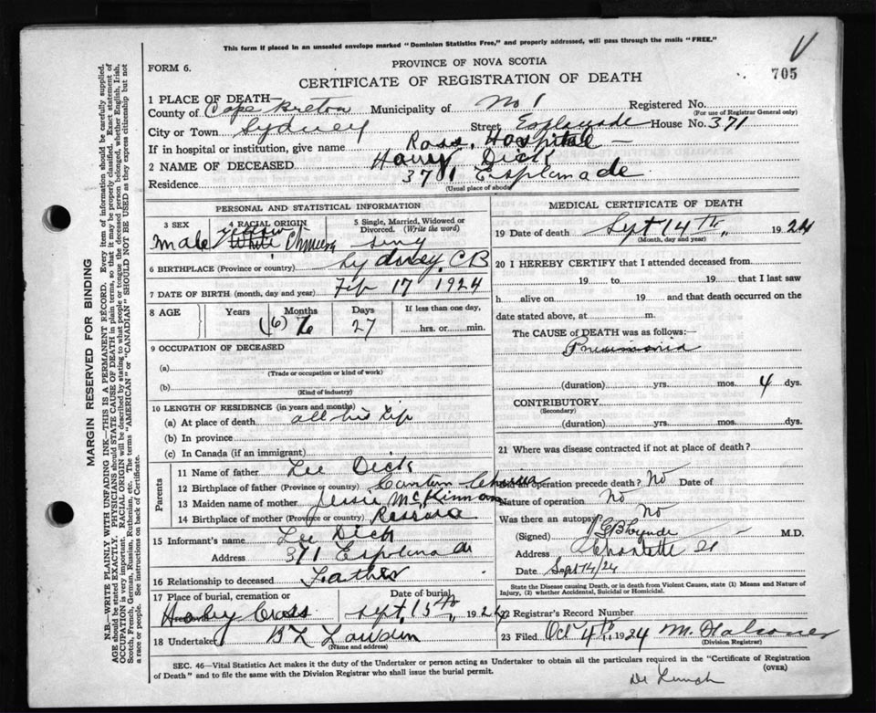 Death Registration: Year: 1924 file: 79 number: 705
