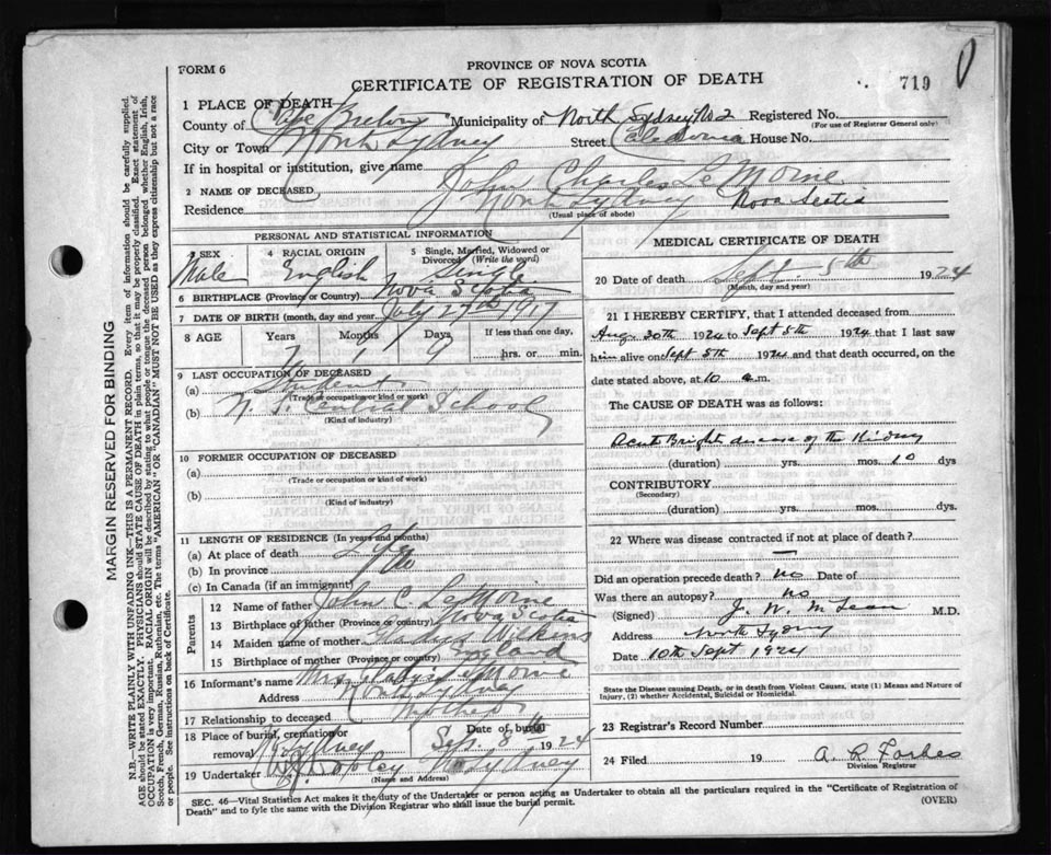 Death Registration: Year: 1924 file: 79 number: 719