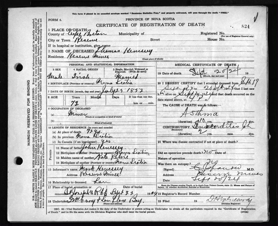 Death Registration: Year: 1924 file: 79 number: 824