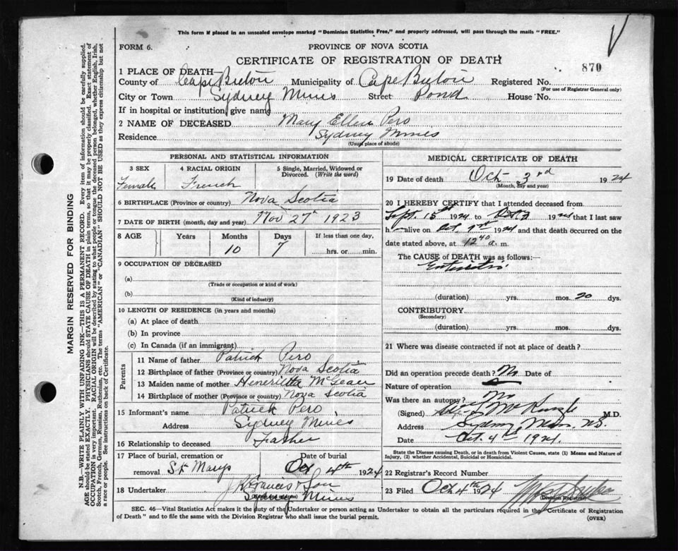 Death Registration: Year: 1924 file: 79 number: 870