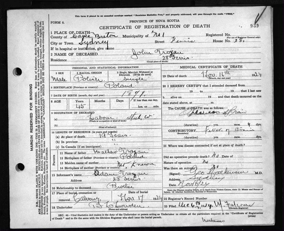 Death Registration: Year: 1924 file: 79 number: 939