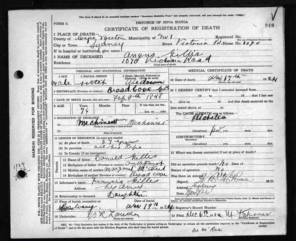 Death Registration: Year: 1924 file: 79 number: 940