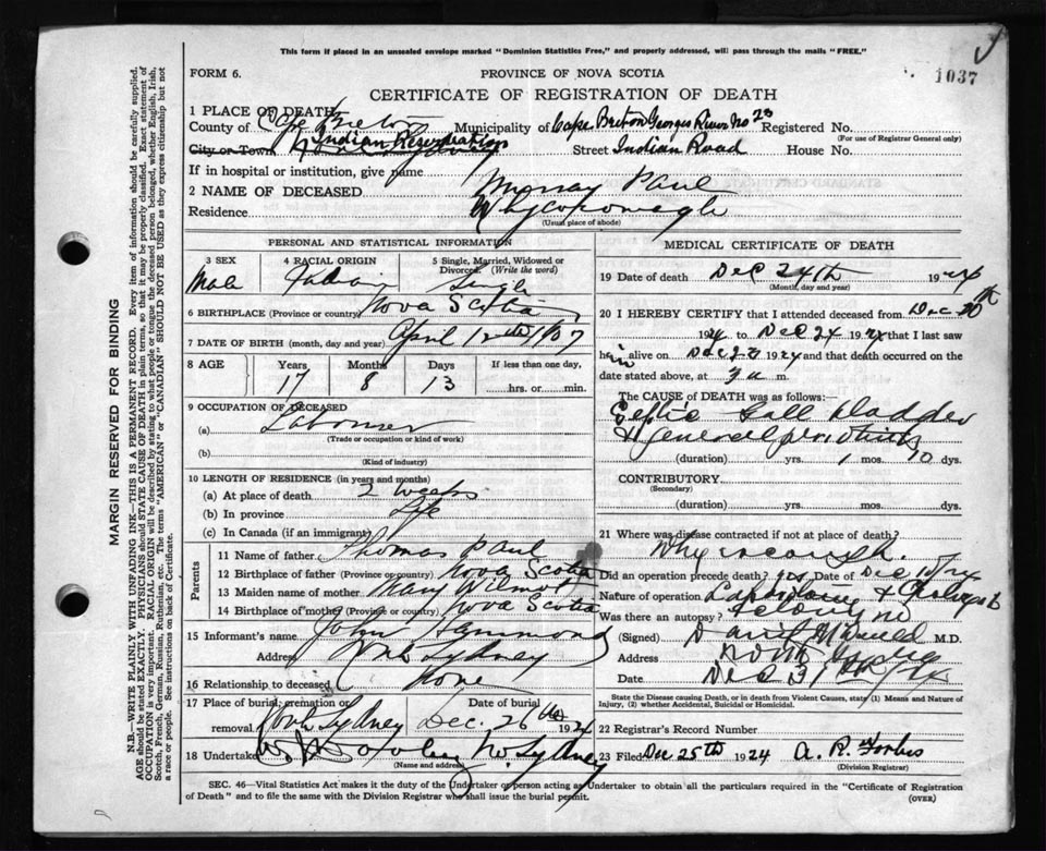 Death Registration: Year: 1924 file: 79 number: 1037