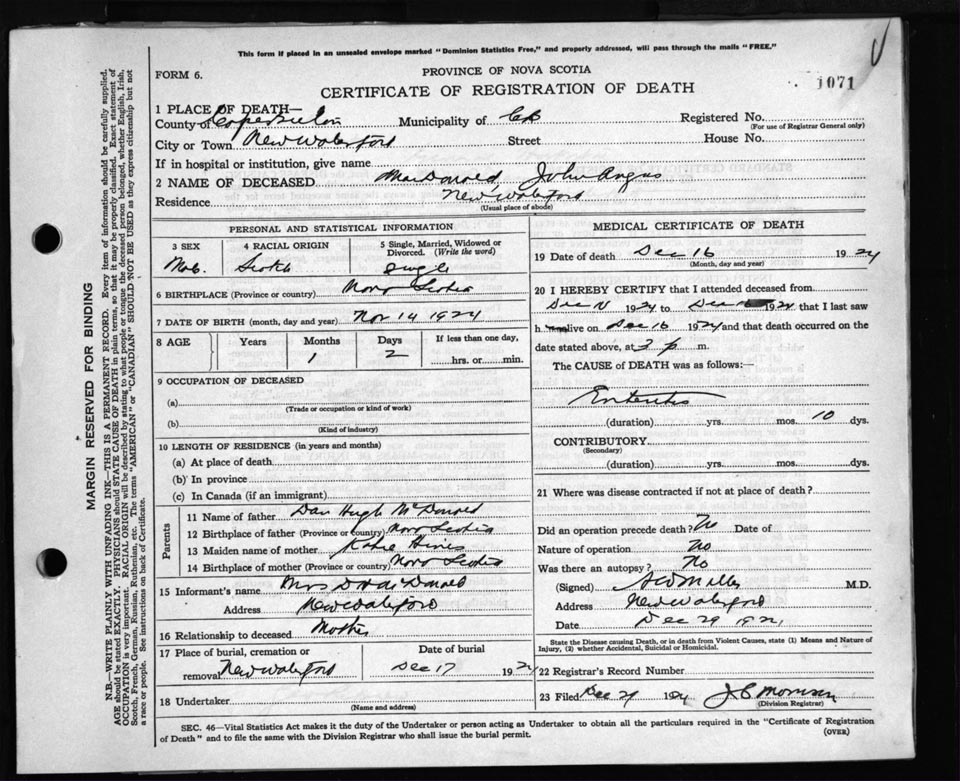 Death Registration: Year: 1924 file: 79 number: 1071