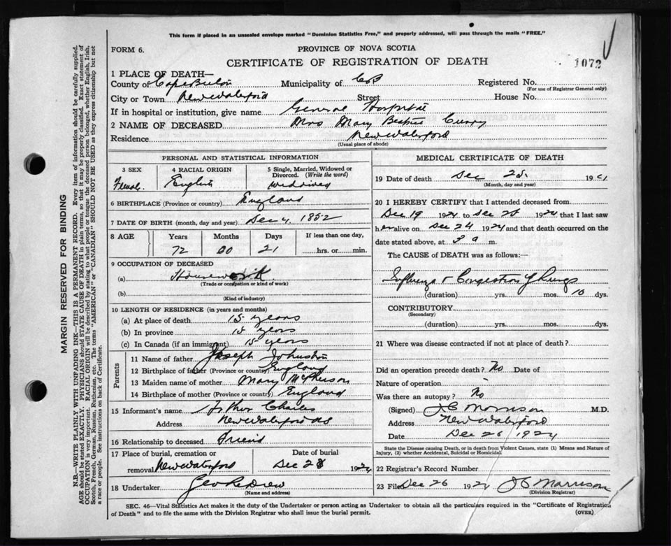Death Registration: Year: 1924 file: 79 number: 1072