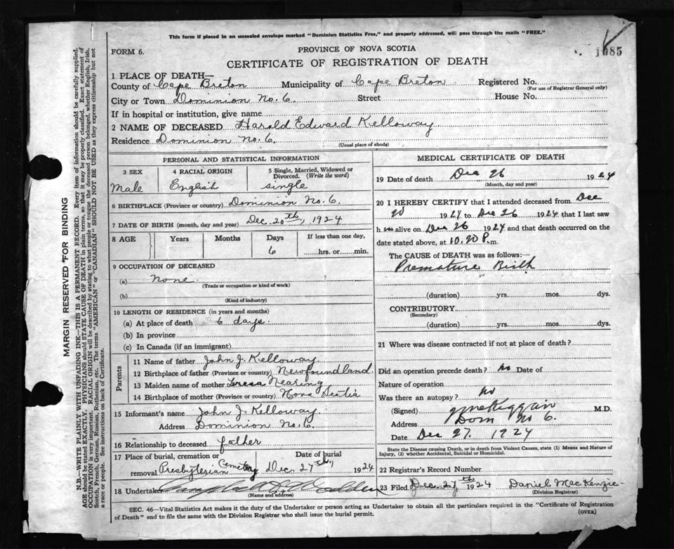 Death Registration: Year: 1924 file: 79 number: 1085