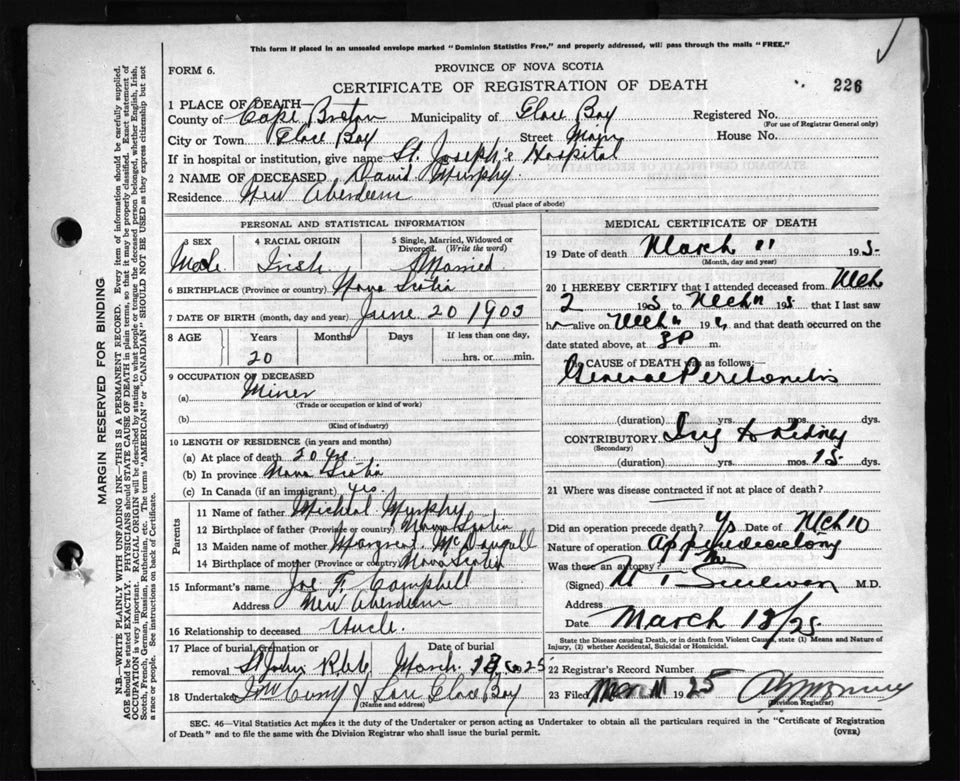Death Registration: Year: 1925 file: 80 number: 226