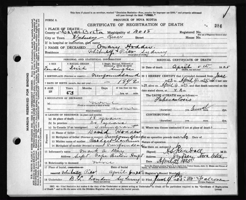 Death Registration: Year: 1925 file: 80 number: 284