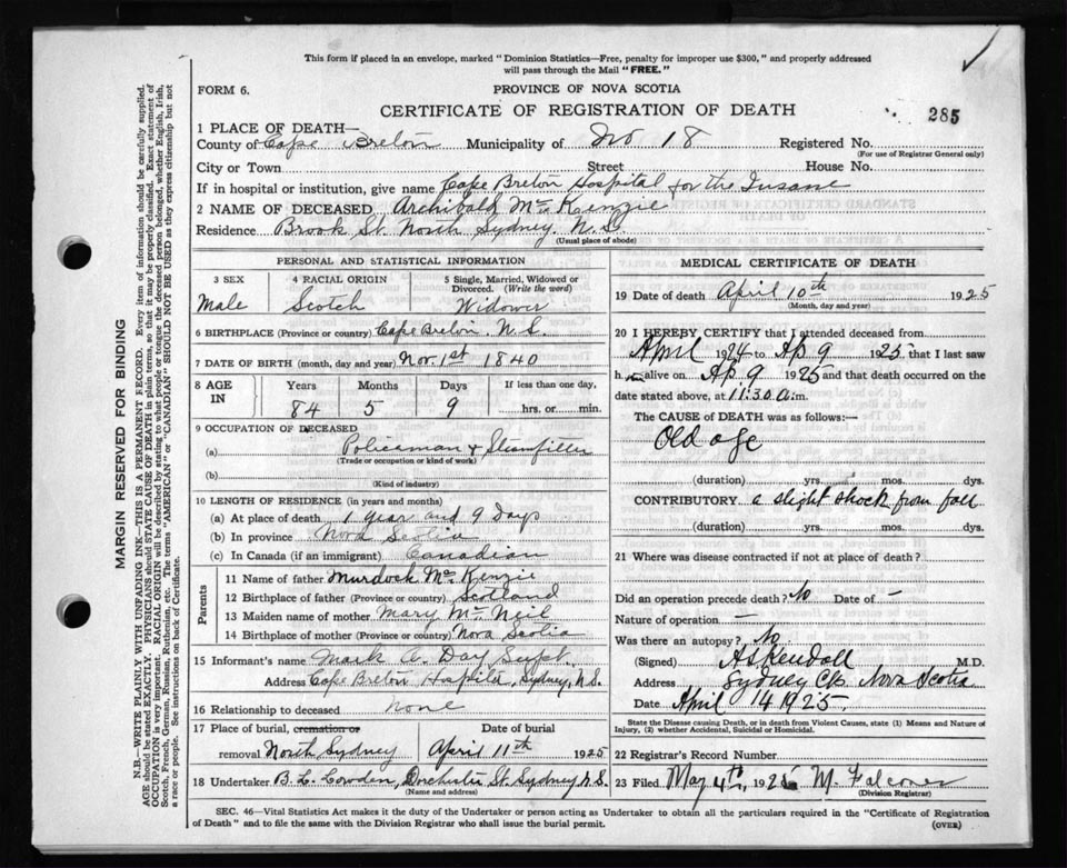 Death Registration: Year: 1925 file: 80 number: 285
