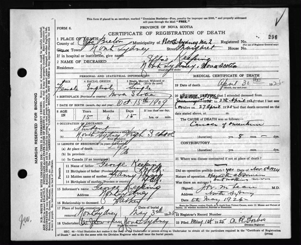 Death Registration: Year: 1925 file: 80 number: 296