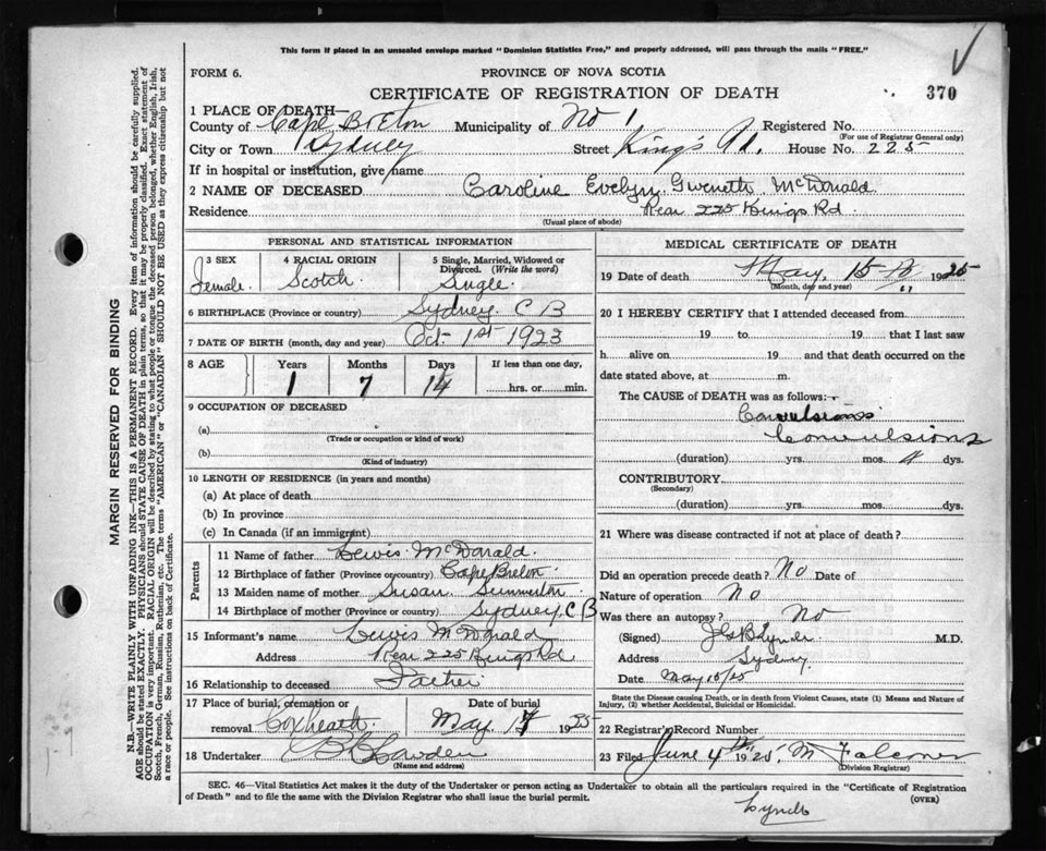 Death Registration: Year: 1925 file: 80 number: 370