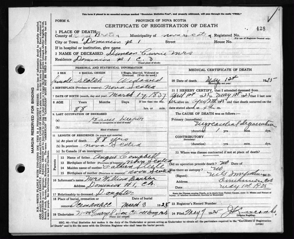 Death Registration: Year: 1925 file: 80 number: 428