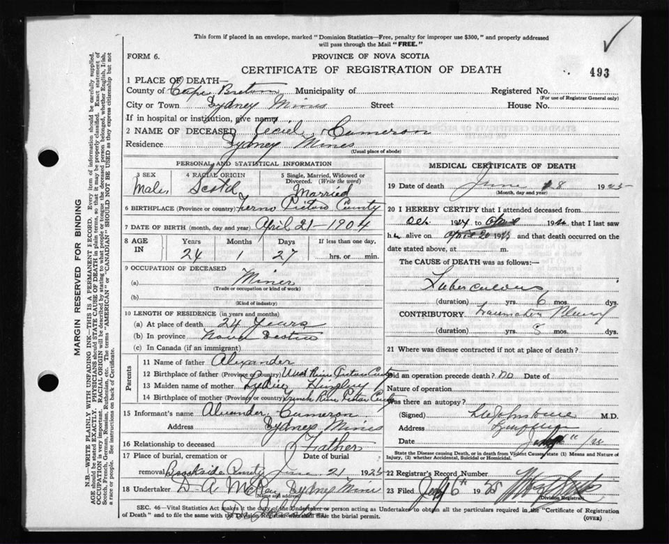 Death Registration: Year: 1925 file: 80 number: 493