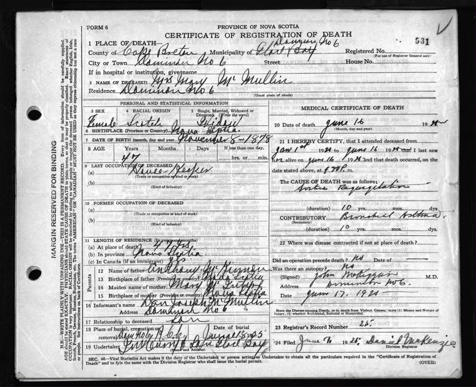 Death Registration: Year: 1925 file: 80 number: 531