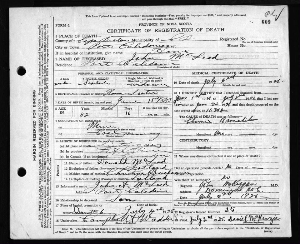 Death Registration: Year: 1925 file: 80 number: 609