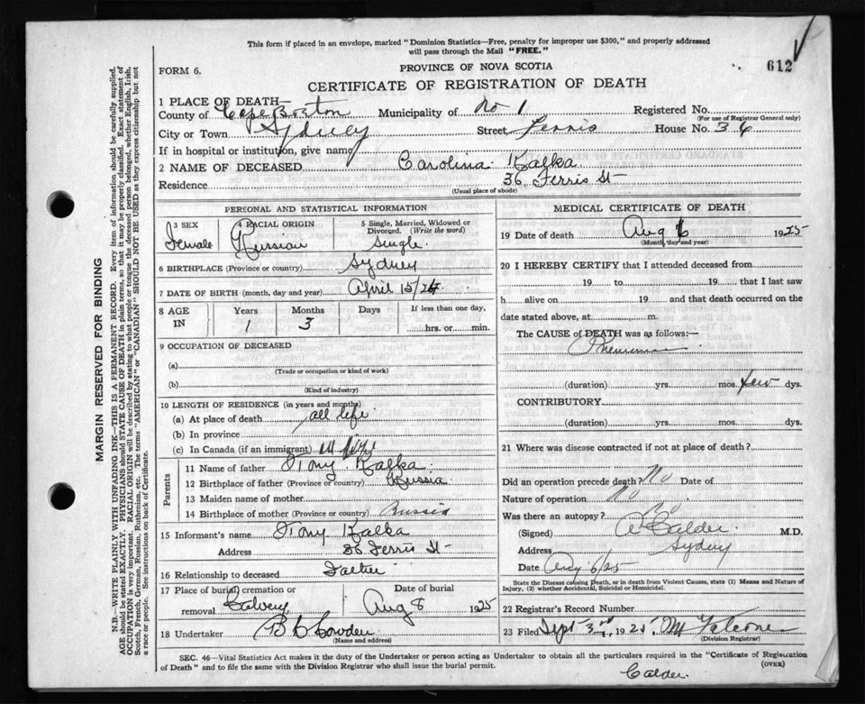 Death Registration: Year: 1925 file: 80 number: 612