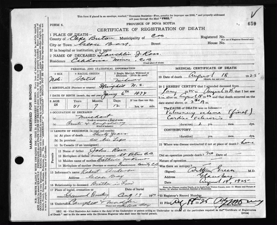 Death Registration: Year: 1925 file: 80 number: 650