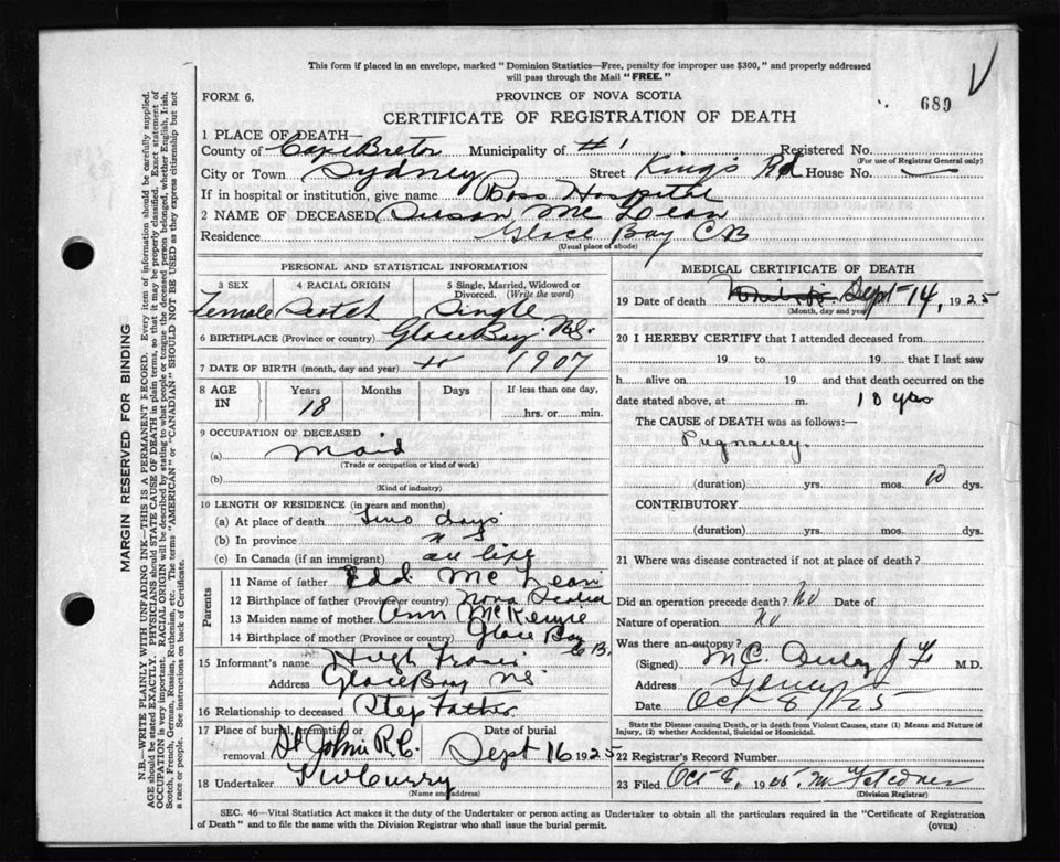 Death Registration: Year: 1925 file: 80 number: 689