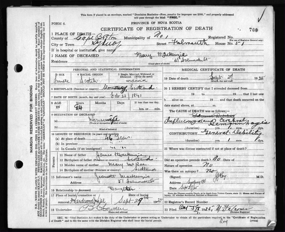 Death Registration: Year: 1925 file: 80 number: 700