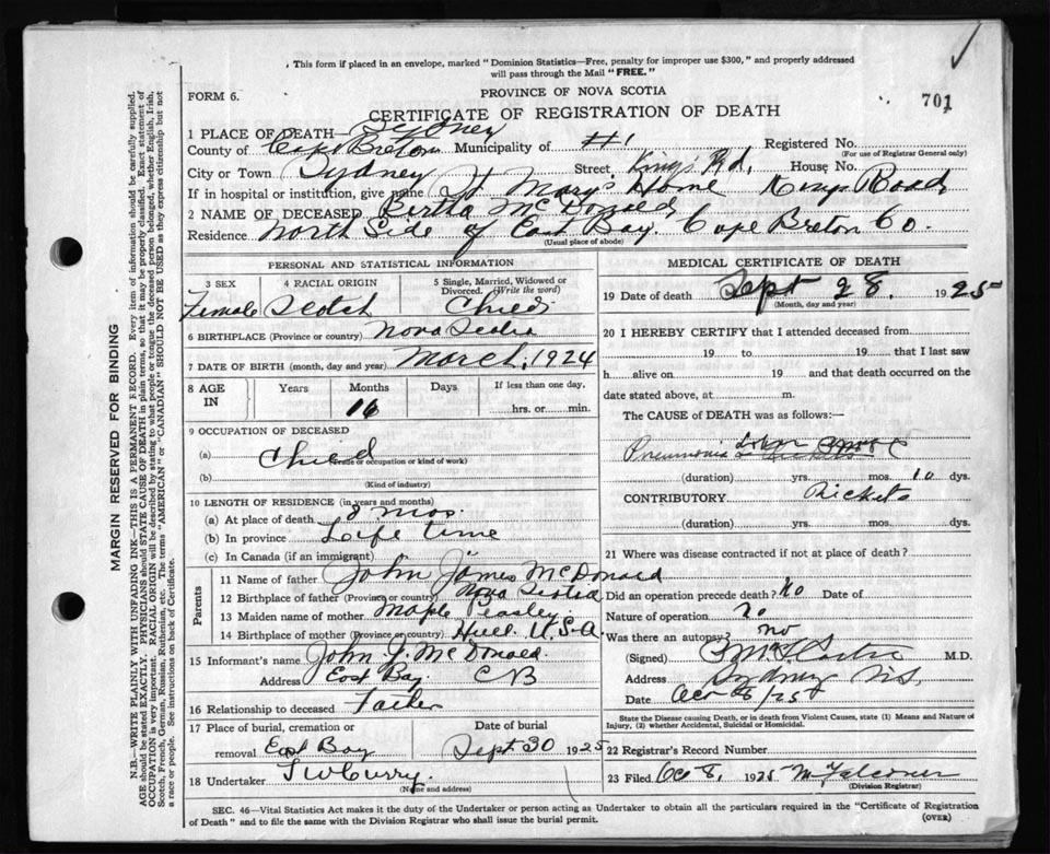 Death Registration: Year: 1925 file: 80 number: 701