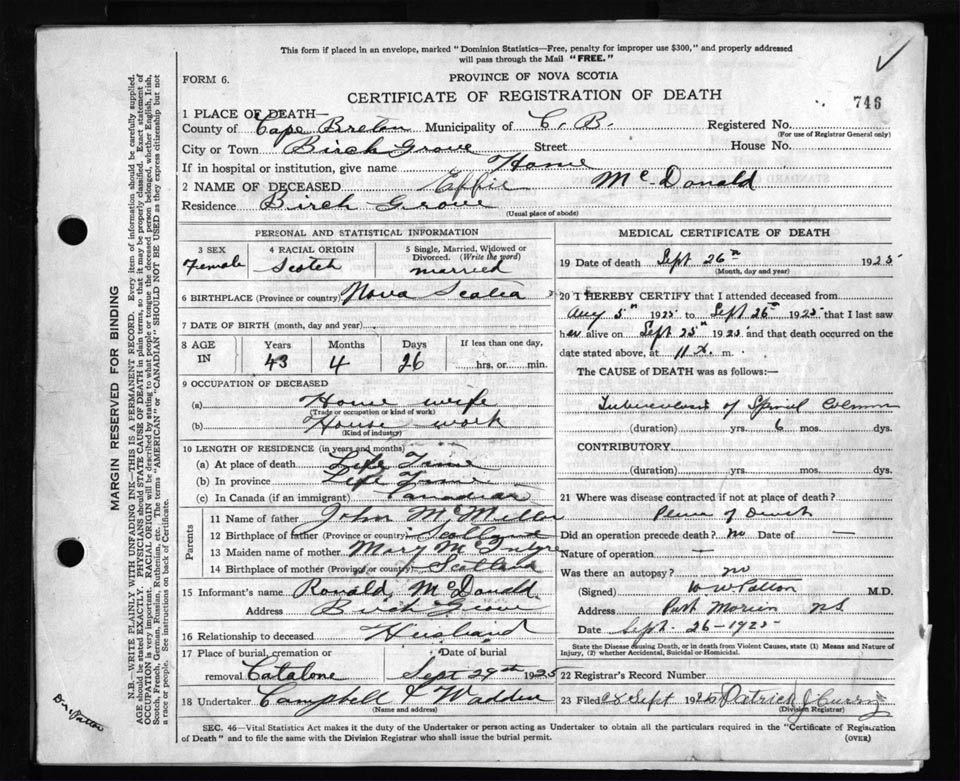 Death Registration: Year: 1925 file: 80 number: 746