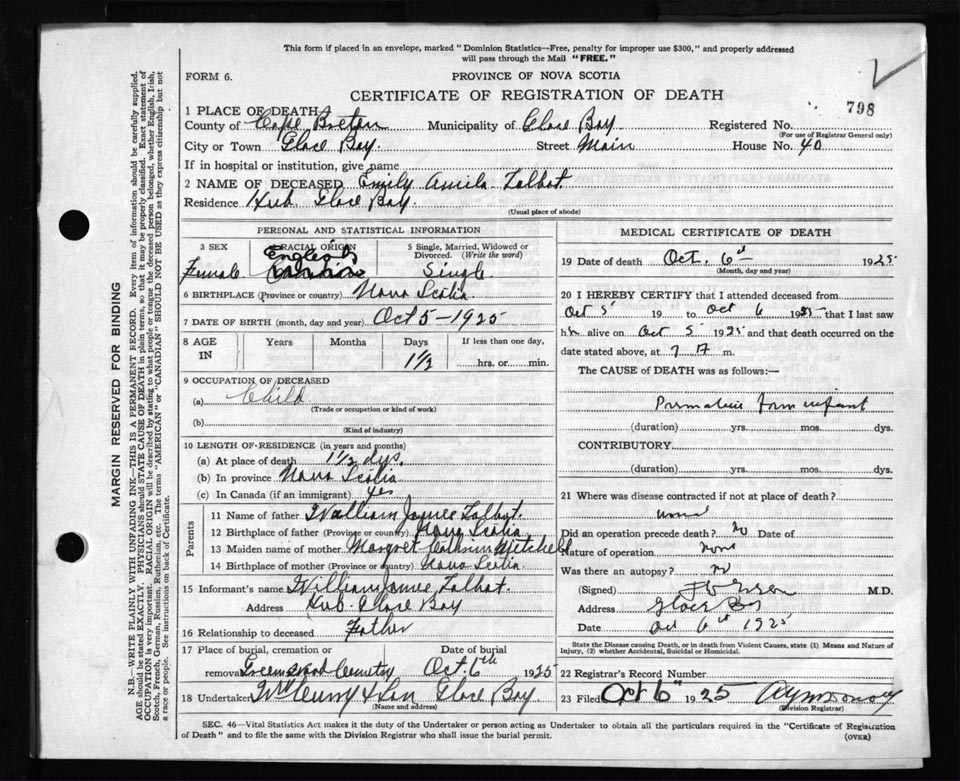 Death Registration: Year: 1925 file: 80 number: 798
