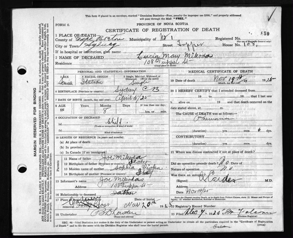 Death Registration: Year: 1925 file: 80 number: 850