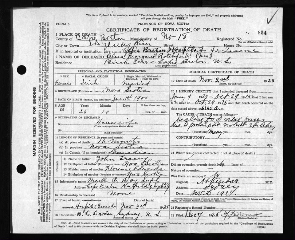 Death Registration: Year: 1925 file: 80 number: 854
