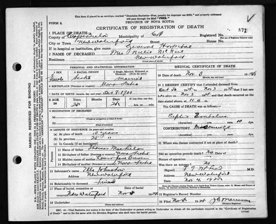 Death Registration: Year: 1925 file: 80 number: 871