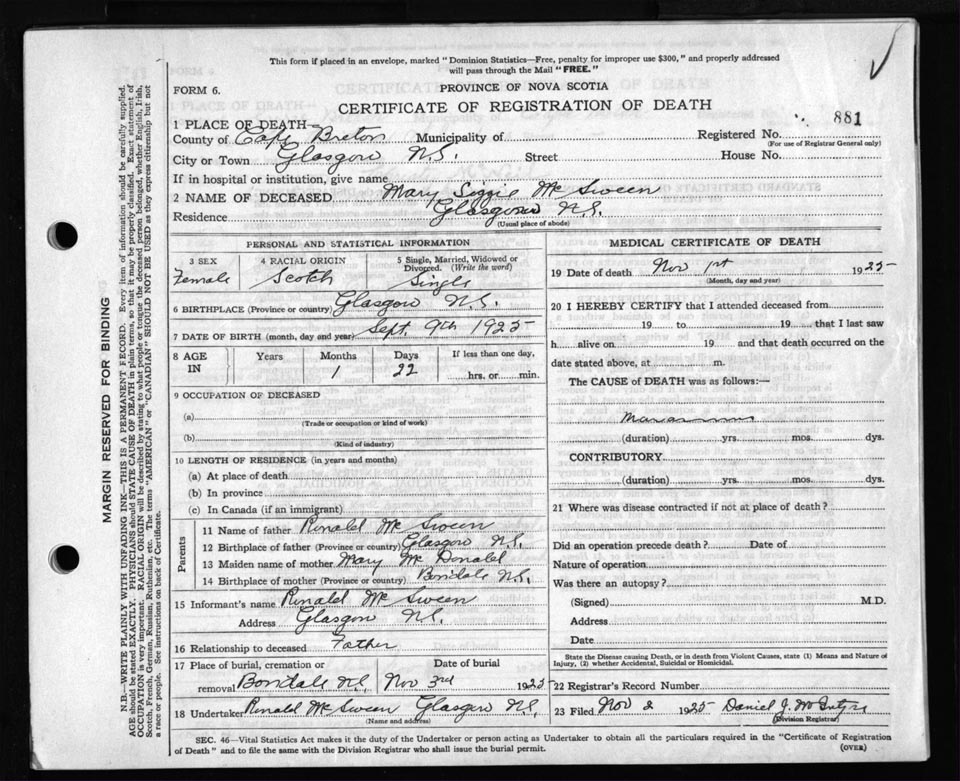 Death Registration: Year: 1925 file: 80 number: 881