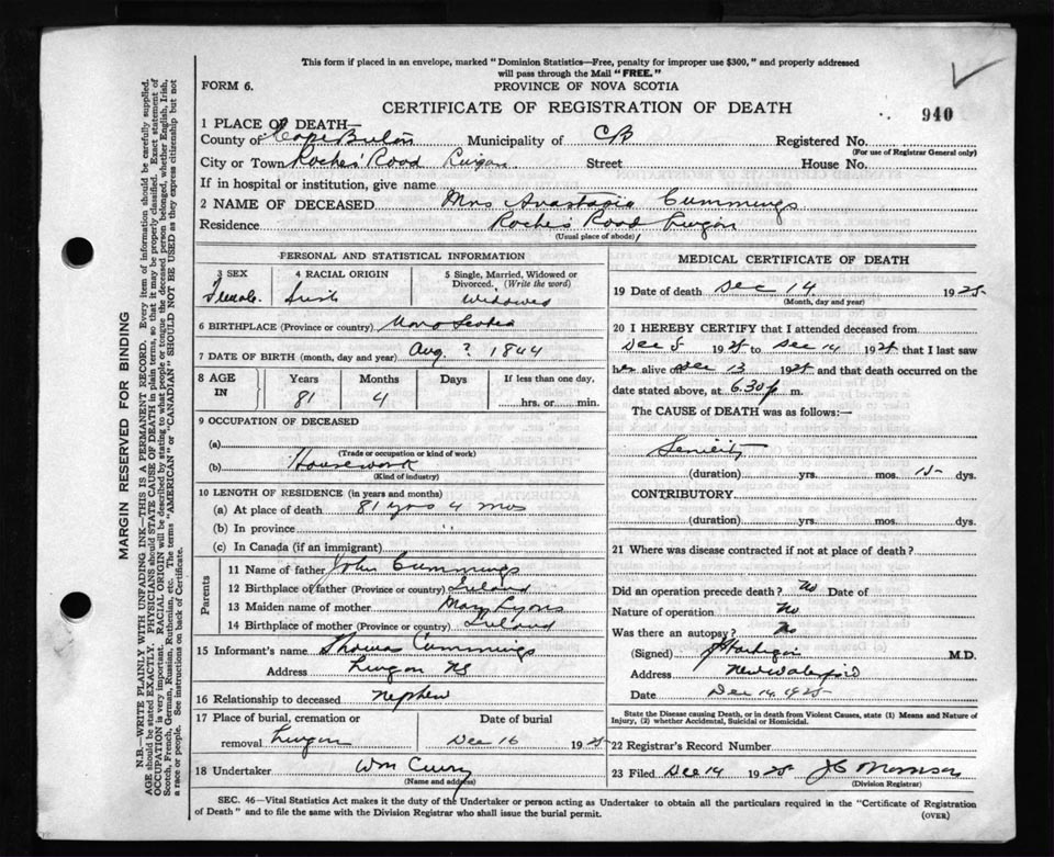 Death Registration: Year: 1925 file: 80 number: 940