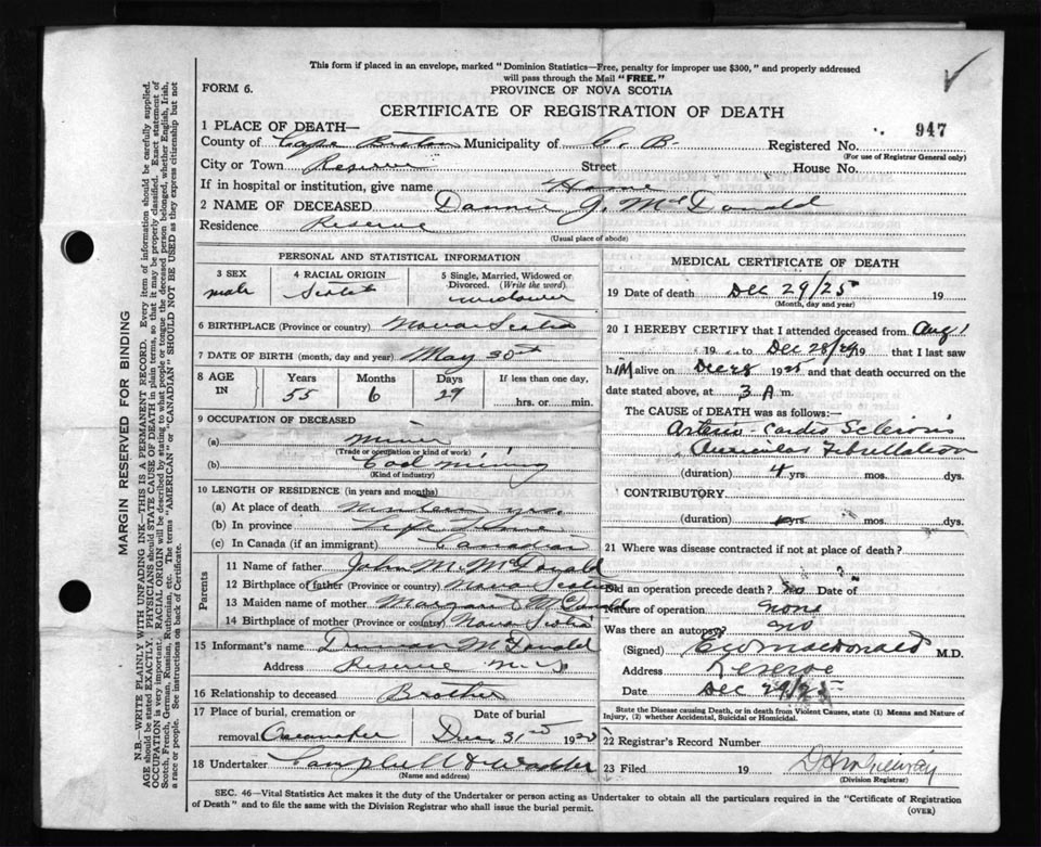 Death Registration: Year: 1925 file: 80 number: 947