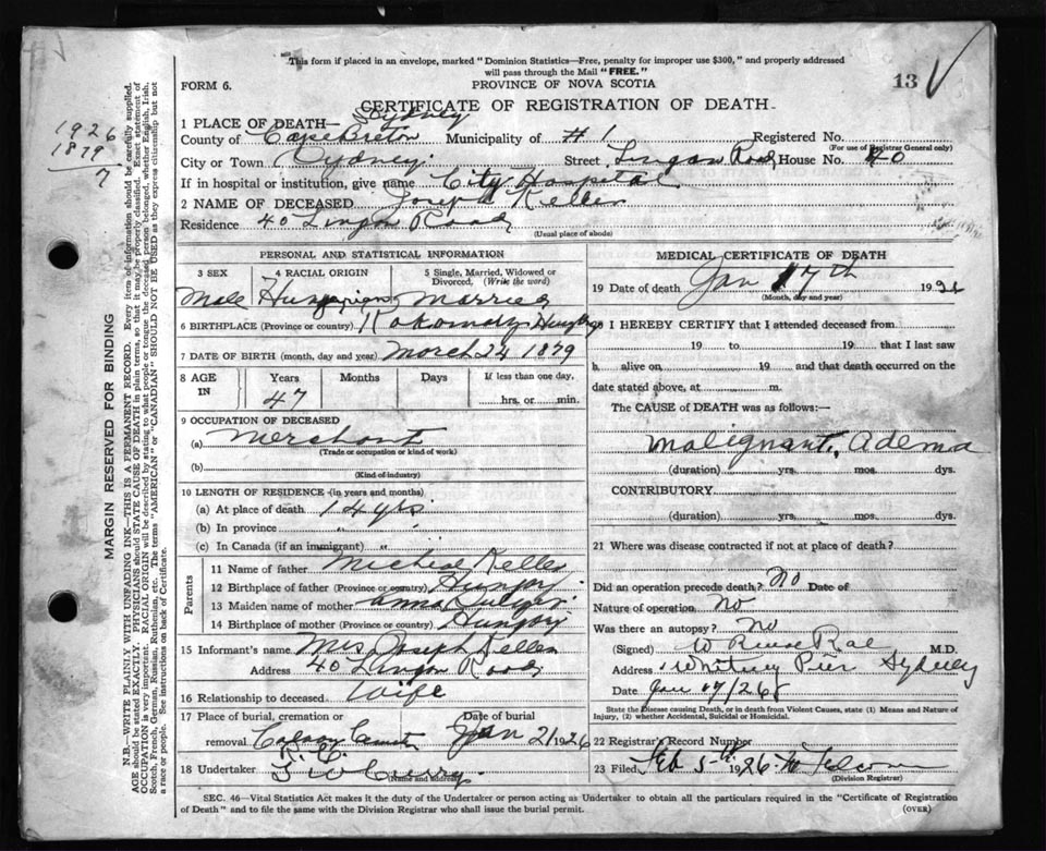 Male Death Registration: Year: 1926 file: 81 number: 13