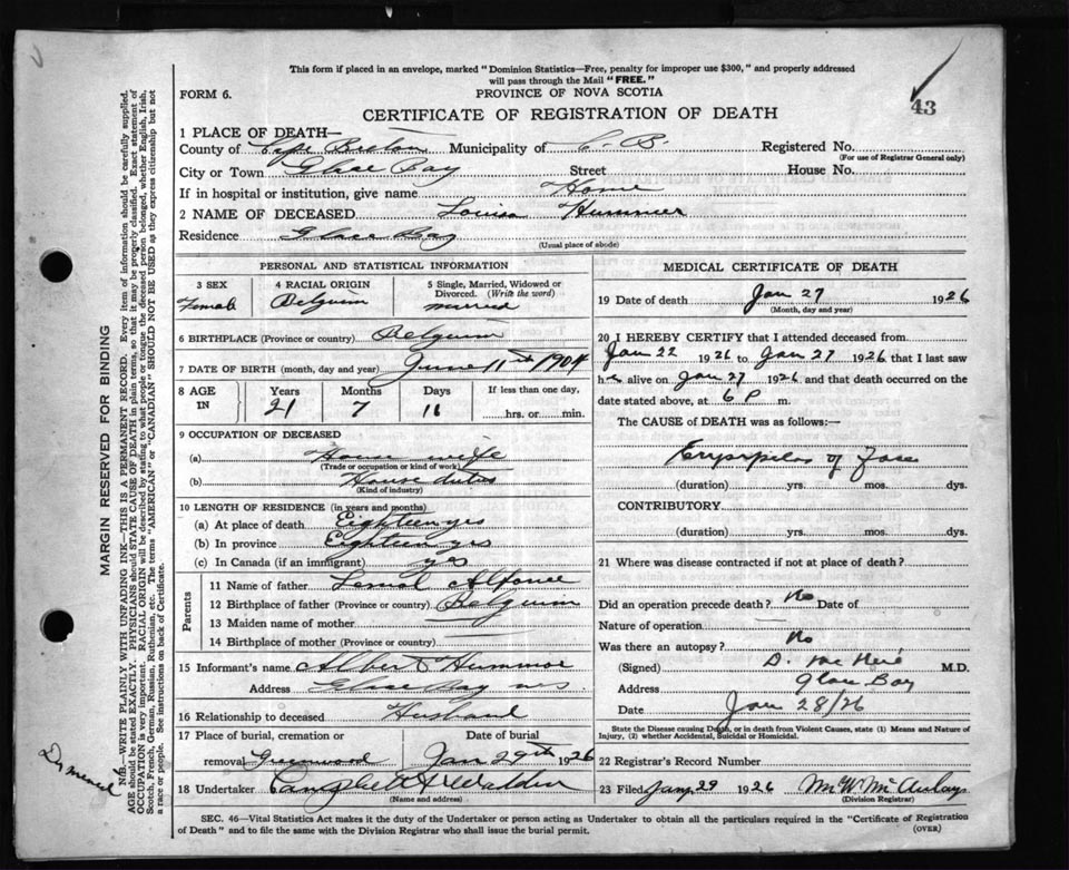Female Death Registration: Year: 1926 file: 81 number: 43