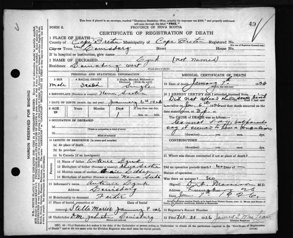Male Death Registration: Year: 1926 file: 81 number: 49