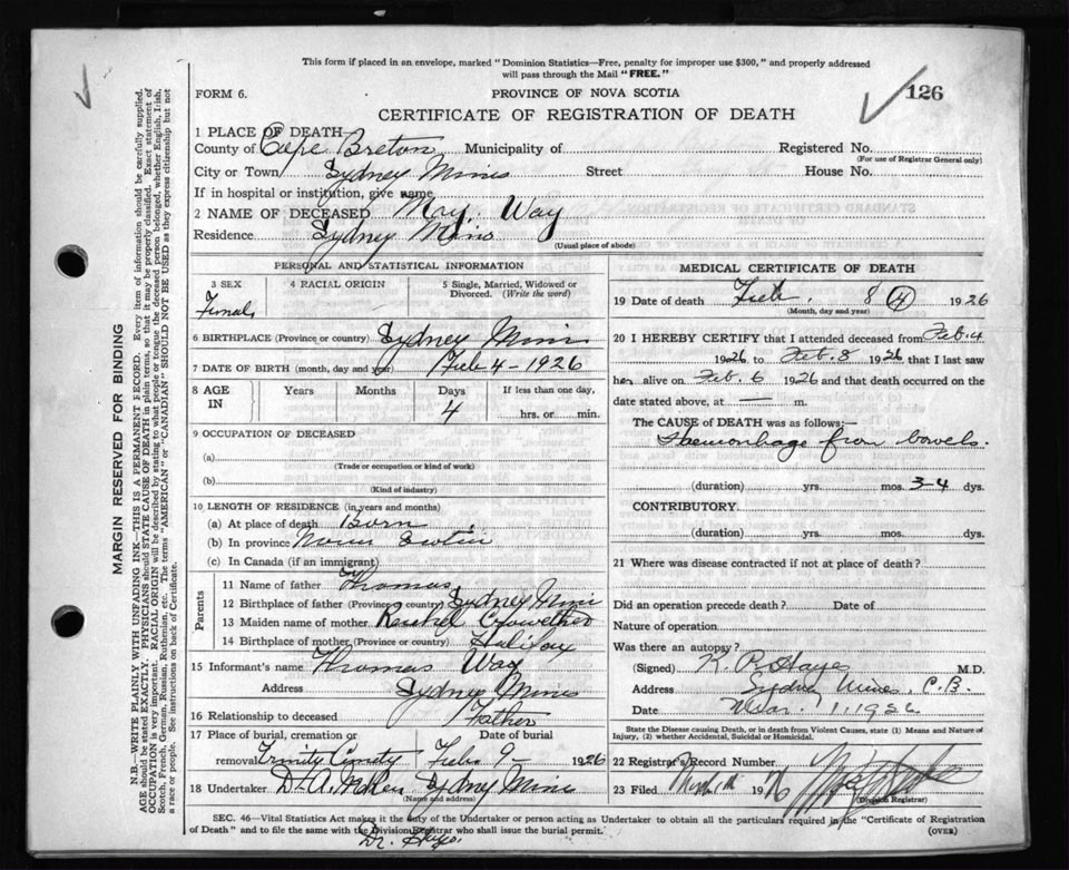 Female Death Registration: Year: 1926 file: 81 number: 126
