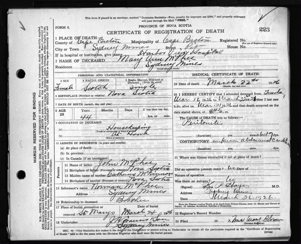 Female Death Registration: Year: 1926 file: 81 number: 223