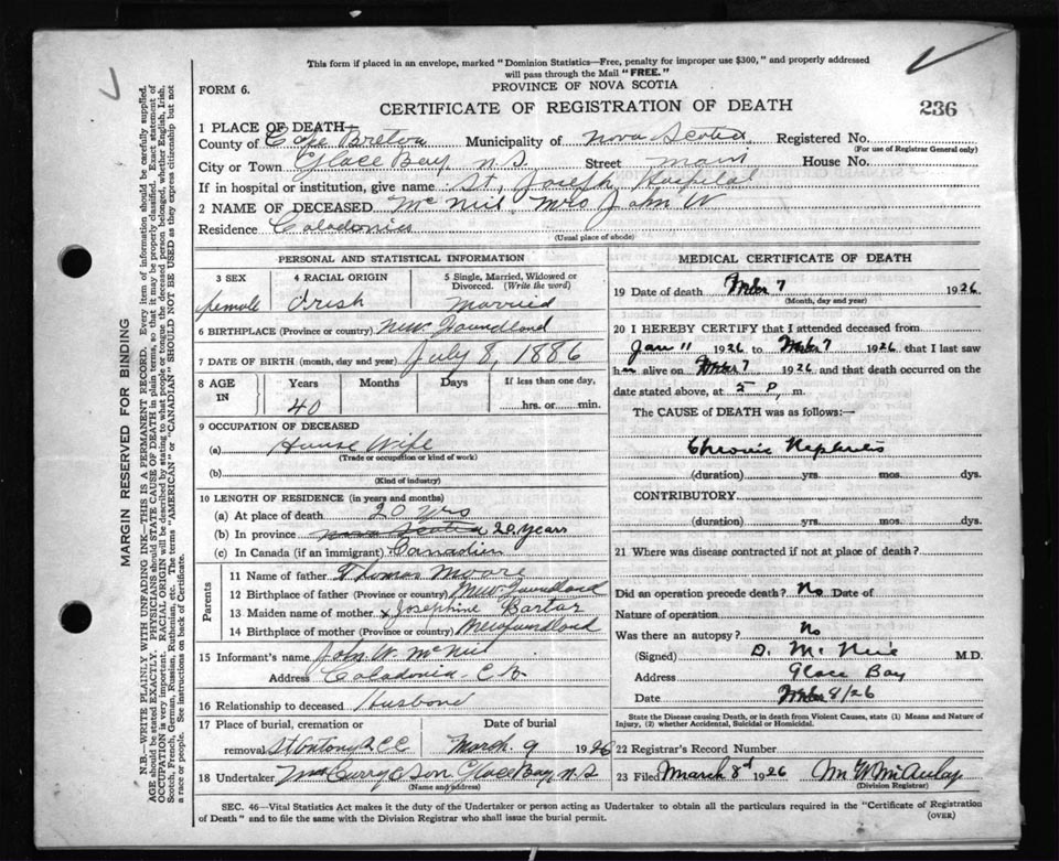 Female Death Registration: Year: 1926 file: 81 number: 236
