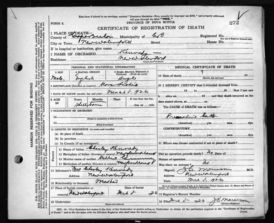 Male Death Registration: Year: 1926 file: 81 number: 272