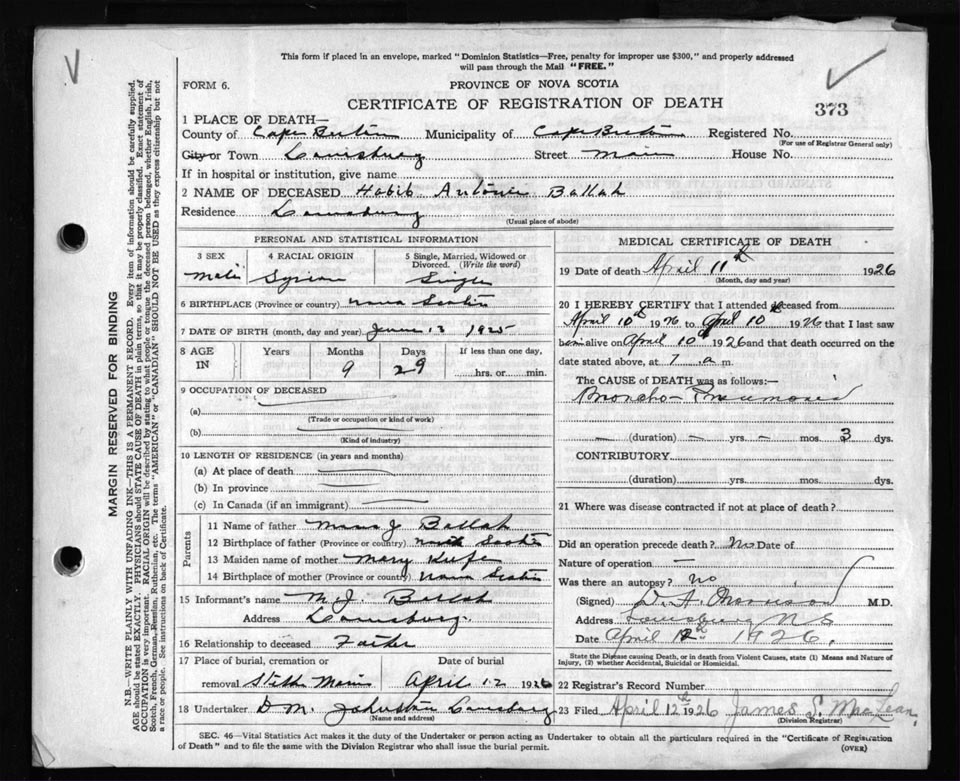 Death Registration: Year: 1926 file: 81 number: 373